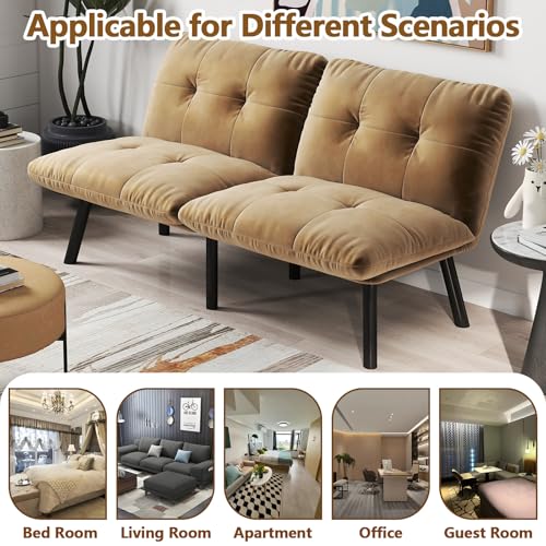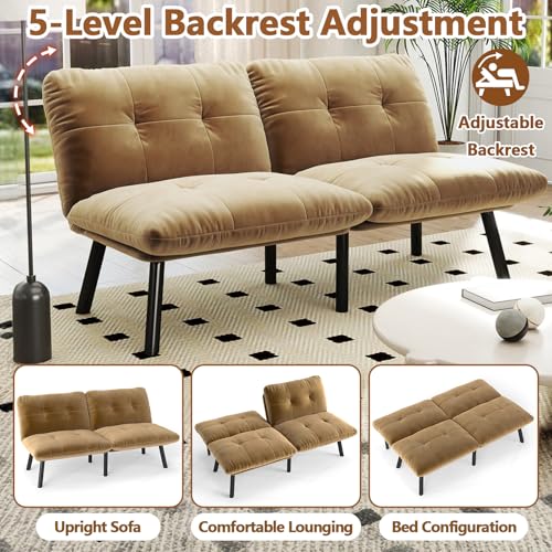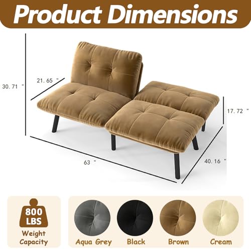63” Futon Sofa Bed, Velvet Futon Couch with Adjustable Backrest, Small Couch for Bedroom Small Spaces Office, Foam Cushions, 800 LBS Capacity (Cream)(Brown)