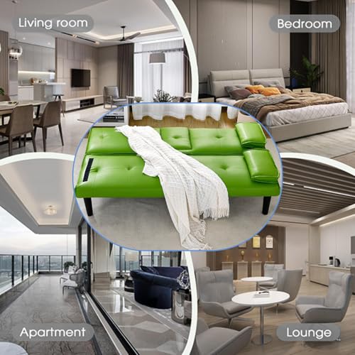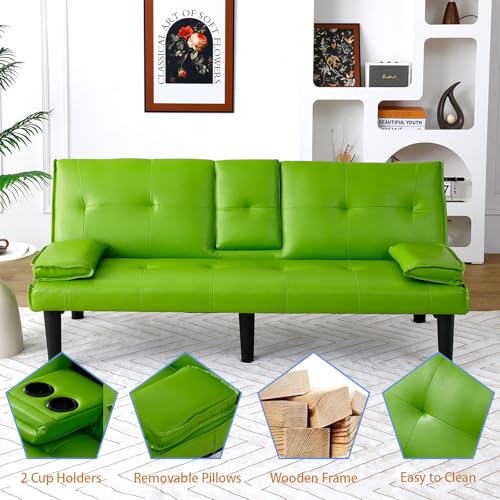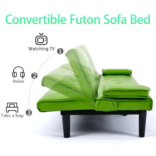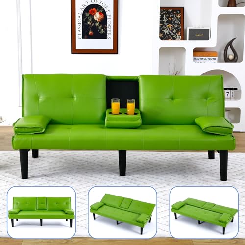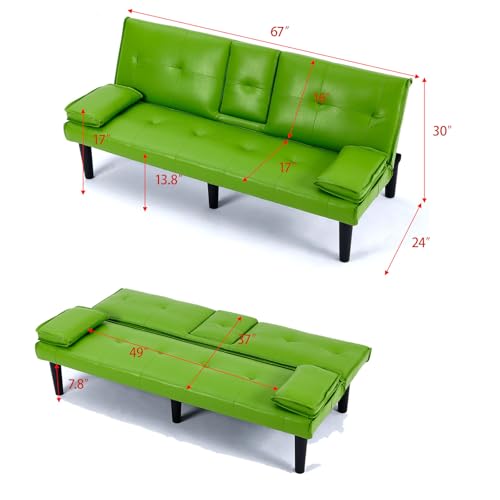 67" Convertible Futon Sofa Bed, Multifunctional Folding Loveseat with Adjustable Backrest & Cup Holders, PU Leather Sleeper Sofa for Small Spaces Living Room, Apartment & Office (Black)(Green)