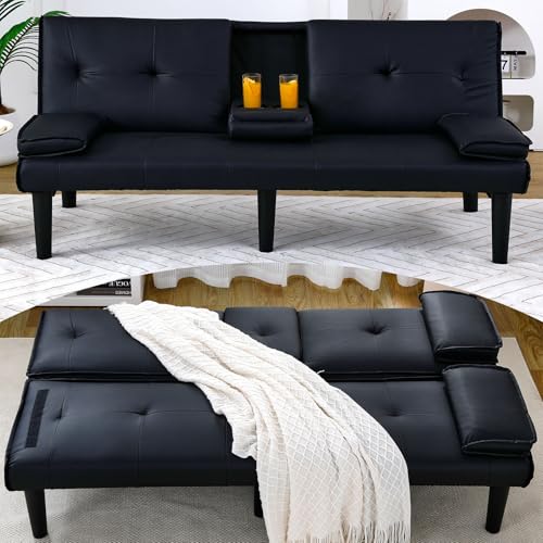Luxurious PU Leather with Built-In Convenience:Designed for modern living, this comfy futon sofa bed features premium PU leather that's soft, durable, and easy to clean. The thoughtful built-in futon with cupholders keeps drinks secure during movie nights or gaming sessions, while removable pillows allow for customized comfort
