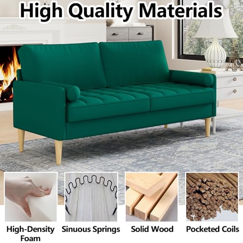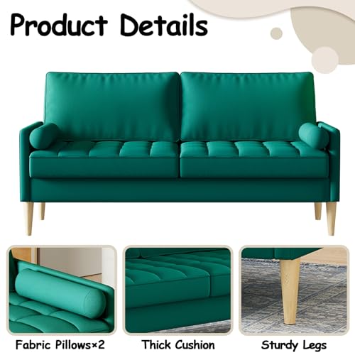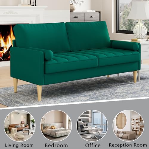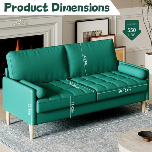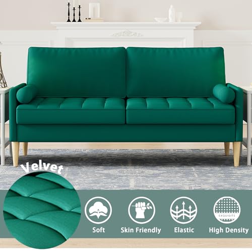 68” Blue Small Couches with Arms & 2 Pillows for Small Spaces, Velvet Loveseat Sofa & Office Couch for Living Room, Modern Comfy 3 Seater Sofa with Tufted Seat, Sturdy Wood Legs (Blue)(Green)