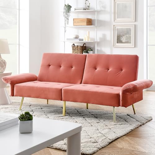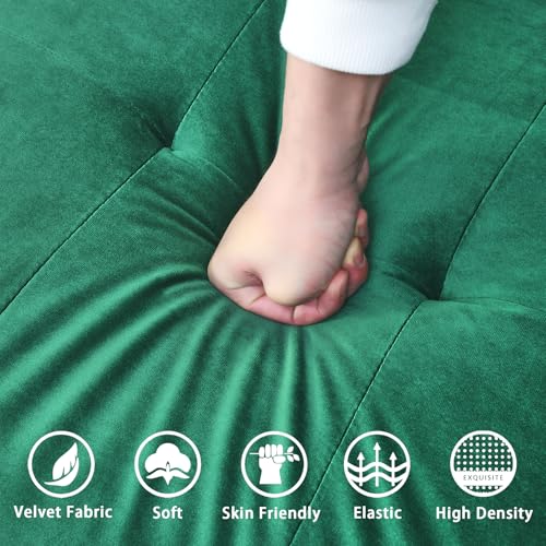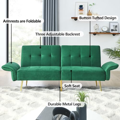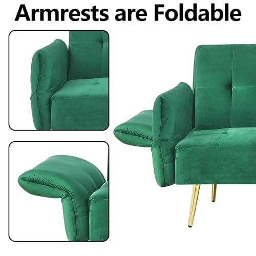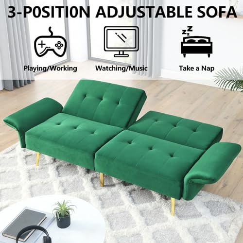 78" Comfy Futon Sofa Bed, Green Velvet Fabric Futon Sofa Bed Couch, Convertible Sleeper Sofa with Adjustable Backrest& Armrests, Modern Loveseat Sleeper for Living Room (Green)(Green)