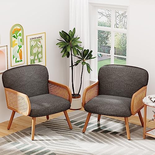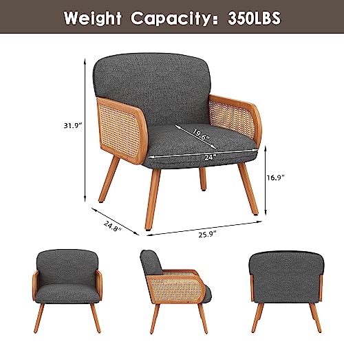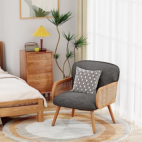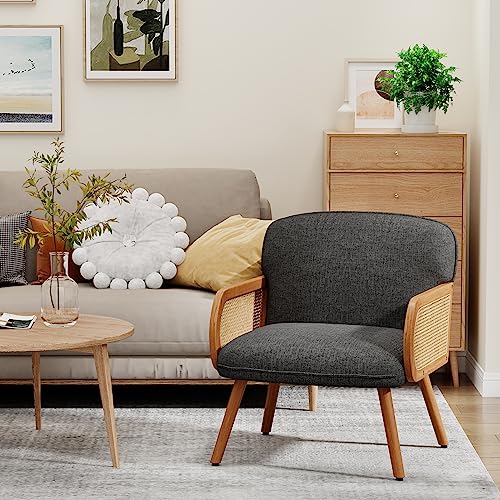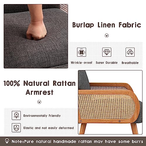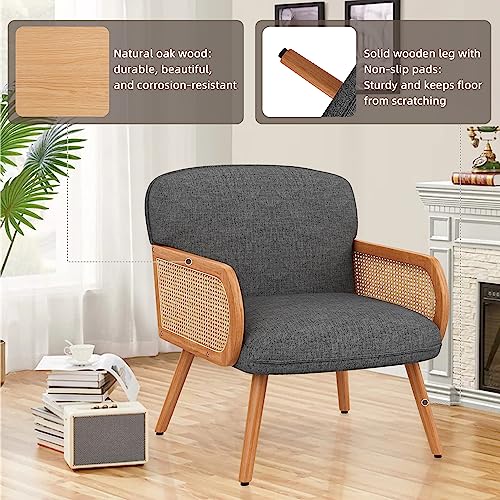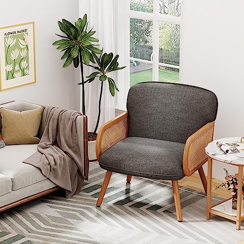 Andeworld Accent Chair with Rattan Arms,Upholstered Mid Century Modern Living Room Armchair, Side Club Chair with Burlap Linen Fabric for Living Room Bedroom Balcony, Dark Grey(Grey Set of 1)