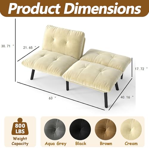 Anwick 63“ Small Futon Sofa Bed, Futon Couch Small Space with 5 Level Adjustable Backrest, Velvet Convertible Futton & Loveseat for Living Room Bedroom Dorm, 800 LBS Capacity (Brown)(Gream)
