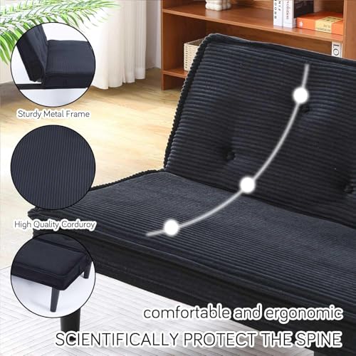 Convertible Futon Sofa Bed - Mid Century Modern Sleeper Loveseat with Golden Metal Legs | Corduroy Black Fabric Couch for Small Spaces | Space-Saving, Comfortable & Stylish