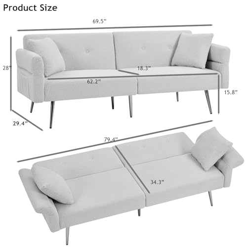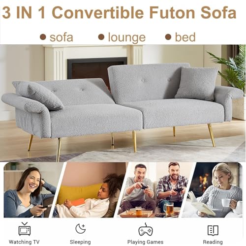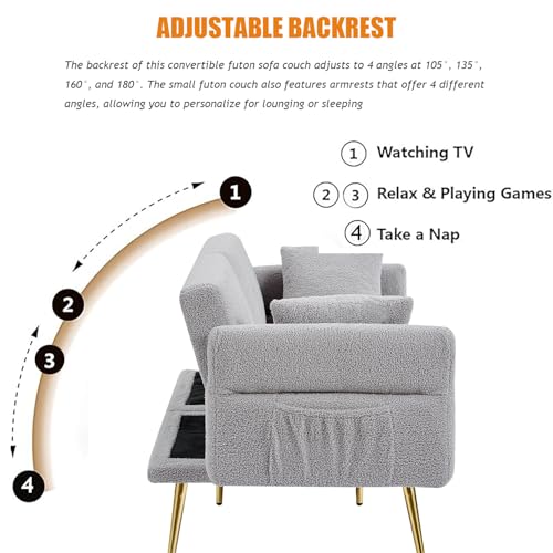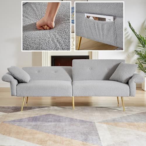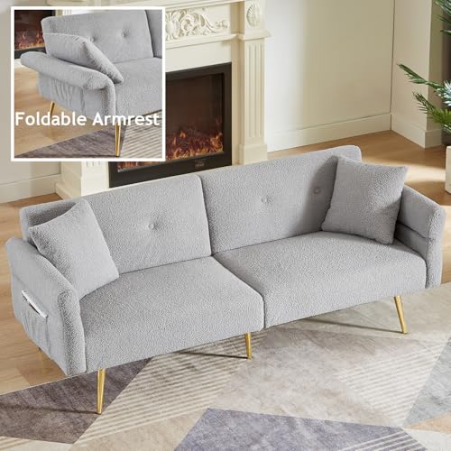 Convertible Futon Sofa Couch Bed,Modern Teddy Loveseat Sleeper with Adjustable Backrest & Foldable Armrest,Folding Couches Bed with Golden Metal Legs for Living Room Apartment Dorm (White)(Grey)