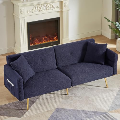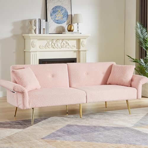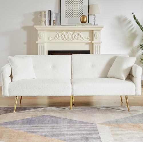 Chic Teddy Fabric & Golden Legs:Elevate your space with plush teddy fabric and eye-catching golden metal legs,The elegant design futon couch fits modern, mid-century, or contemporary decor, while the included pillows add a cozy touch
