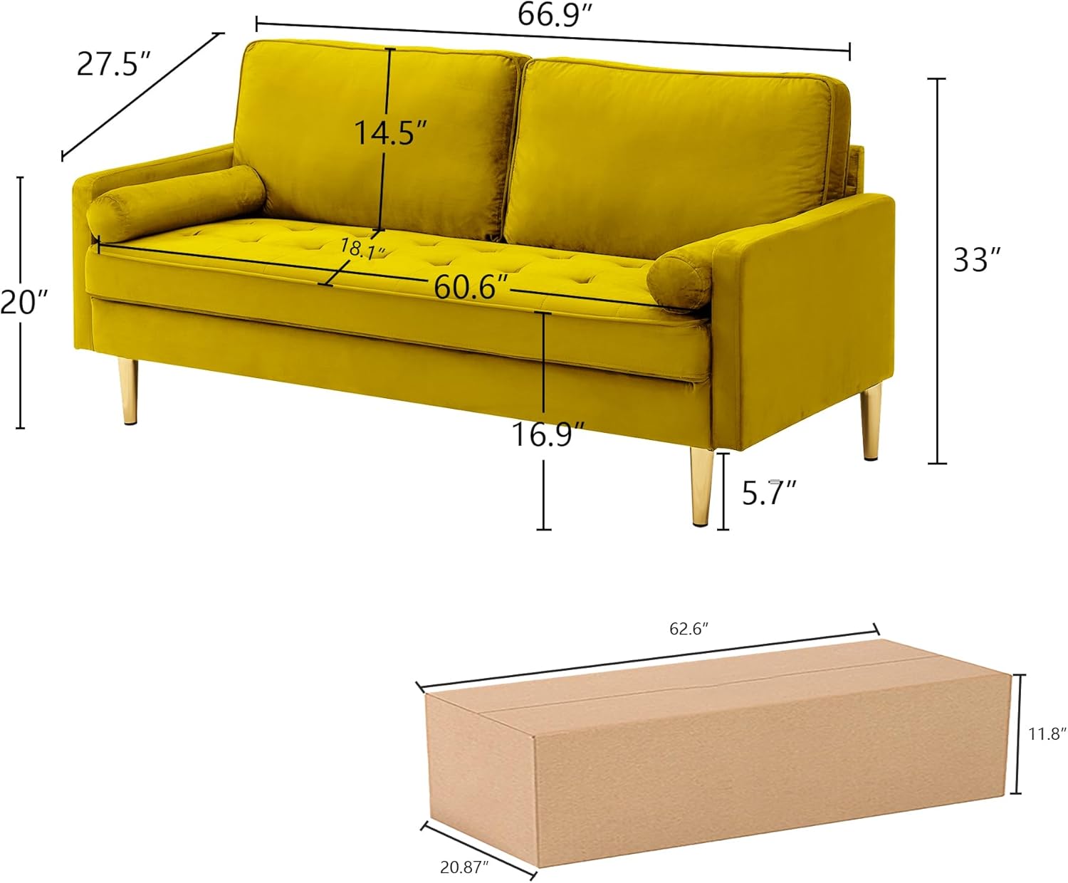 Grey Loveseat Sofa, 67" Velvet Upholstered Mini Small Couch Sofa with 2 Pillows, Bedroom Compact Couch with Gold Metal Legs for Living Room, Office, Apartment (Grey)(Yellow)