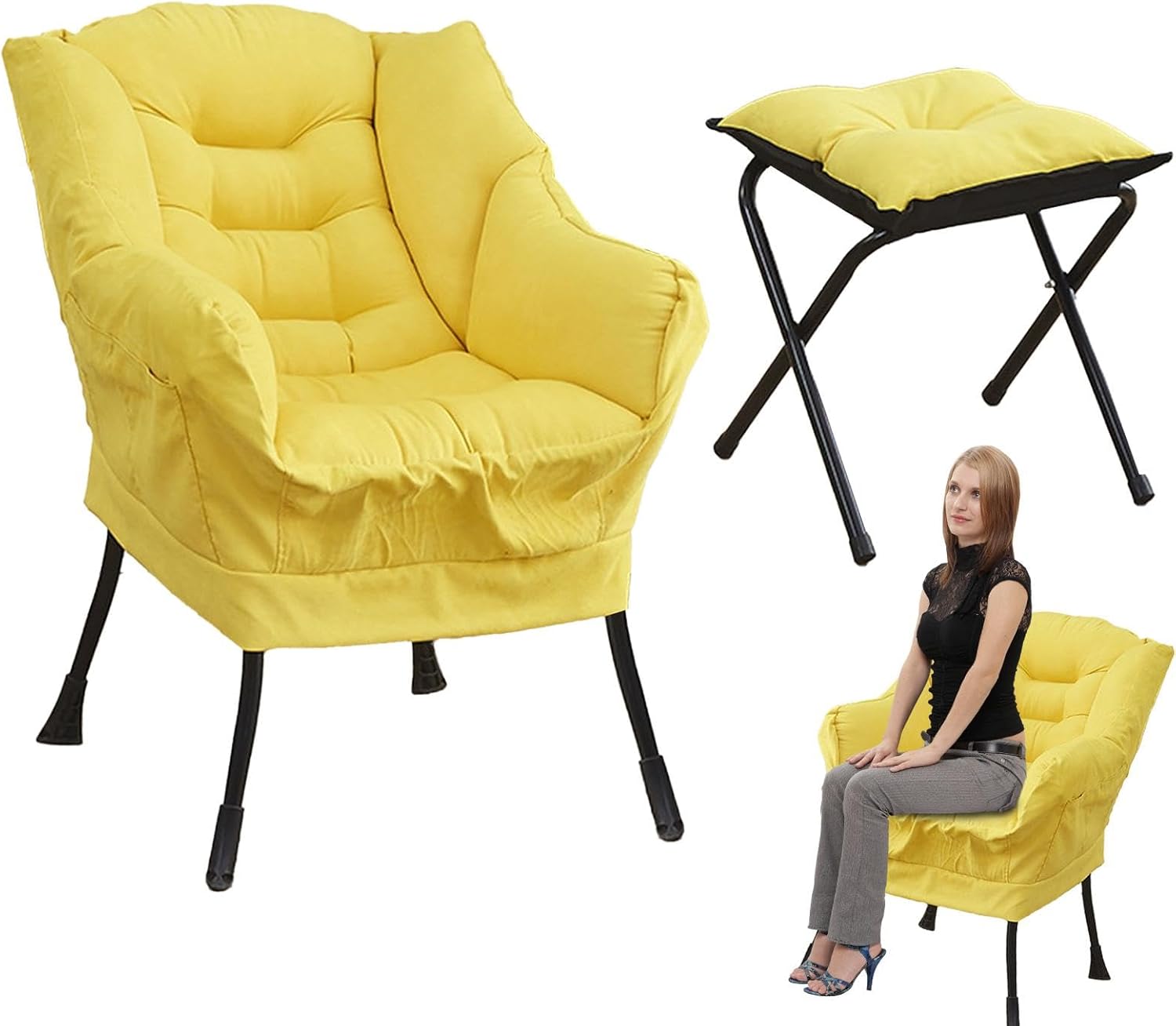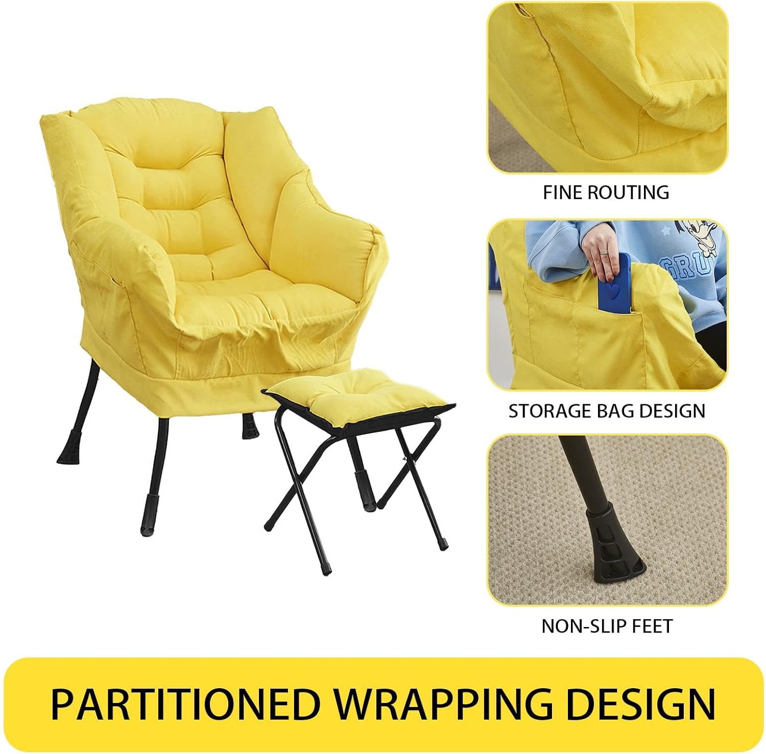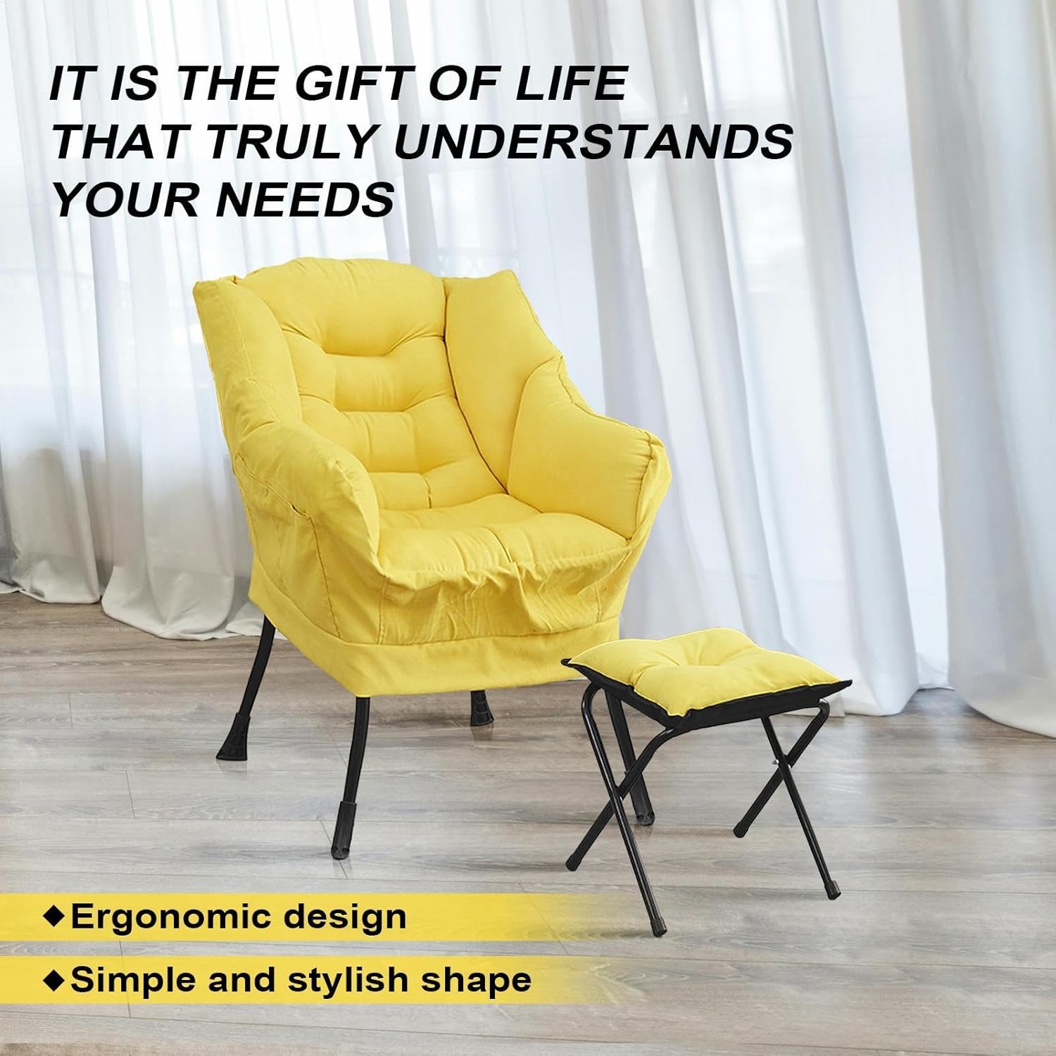 Lazy Chair with Ottoman | Modern Lounge Chair for Bedroom | Large Reclining Accent Chair | Reading Chair with Foldable Footrest | Velvet Sofa Armchair for Dorm, Rooms, Garden and Courty Ard(Yellow)