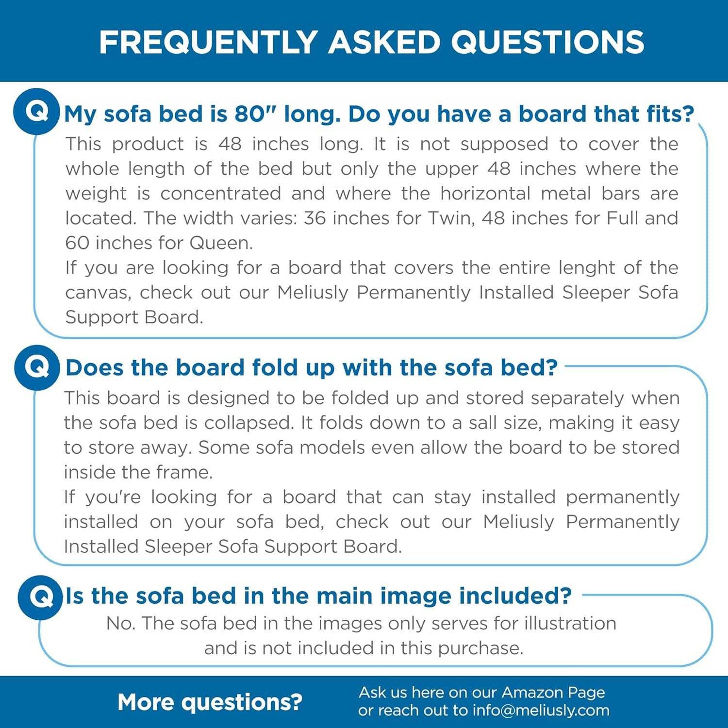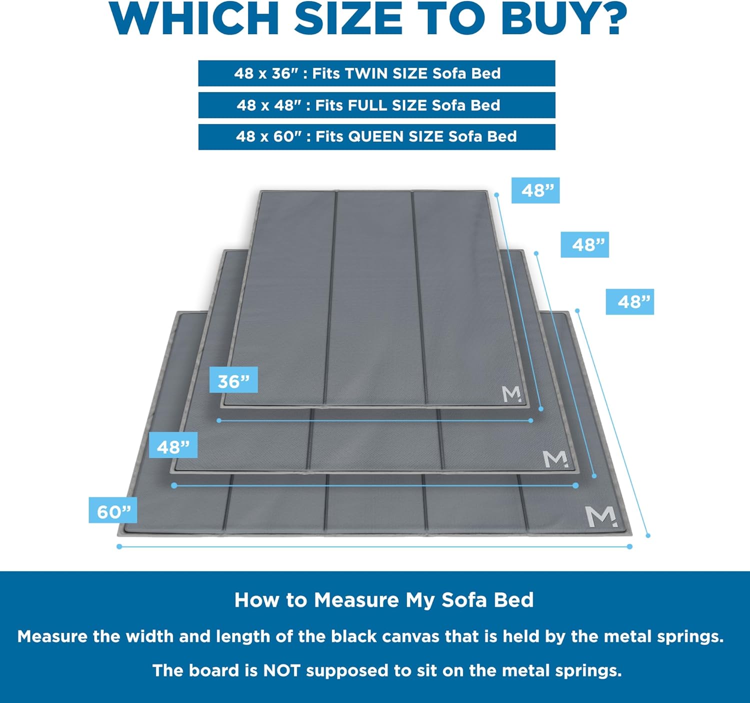 • Easy to Use and Store - The sofa sleeper board comes folded up in the dimensions 48 x16 x 2''. When the sleeper sofa is expanded, the board can simply be unfolded and placed between sleeper bar and mattress. After use, the board can simply be folded up and stored away.