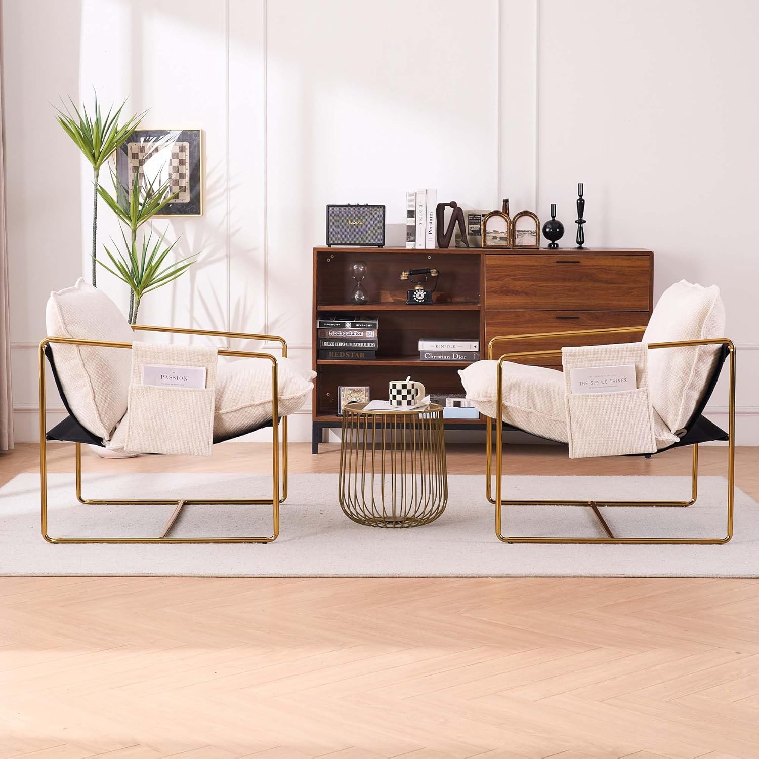 • [2-in-1 Modern Armchair Set] This upholstered hanging armchair set comes with 2 chairs in 1 box, offering space-saving versatility for your living room, bedroom, or office. The gold-plated metal frame adds a touch of elegance while ensuring durability