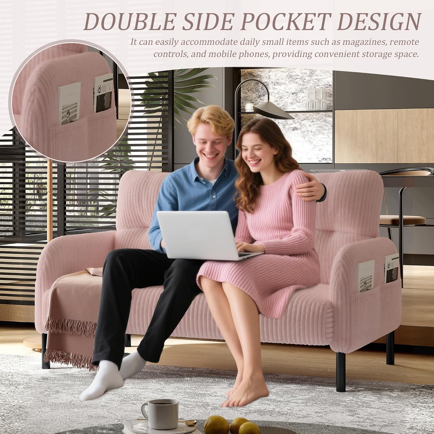 Small Corduroy Fabric Accent Sofa, Comfortable Loveseat Couch with Double Side Pockets, Suitable for Living Room, Bedroom, Apartment (Orange)(Pink)
