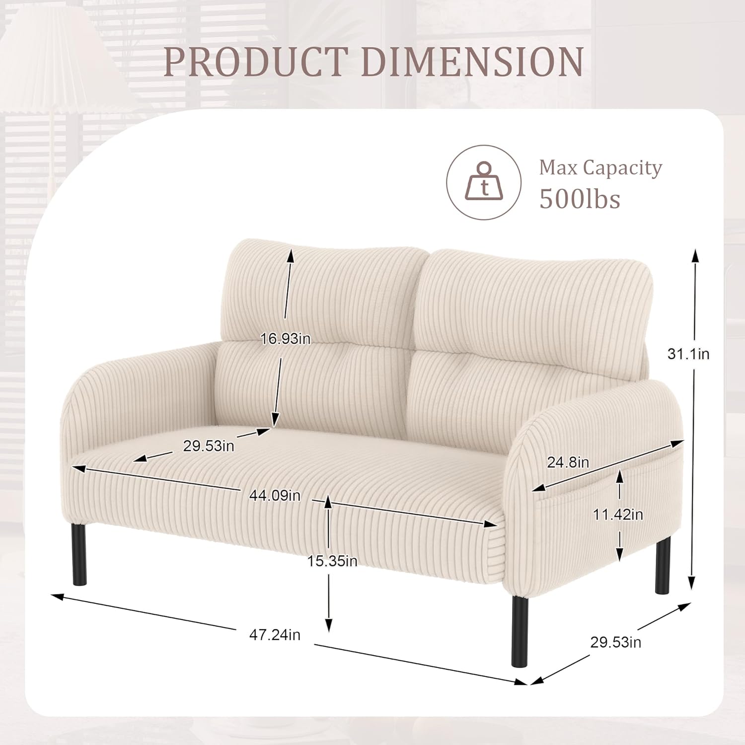 • Convenient Side Storage Pockets: Modern mini sofa Stay organized effortlessly! The double side pockets keep remotes, magazines, or phones within reach, so your seating area stays clutter-free. A smart addition to small-space living or busy households