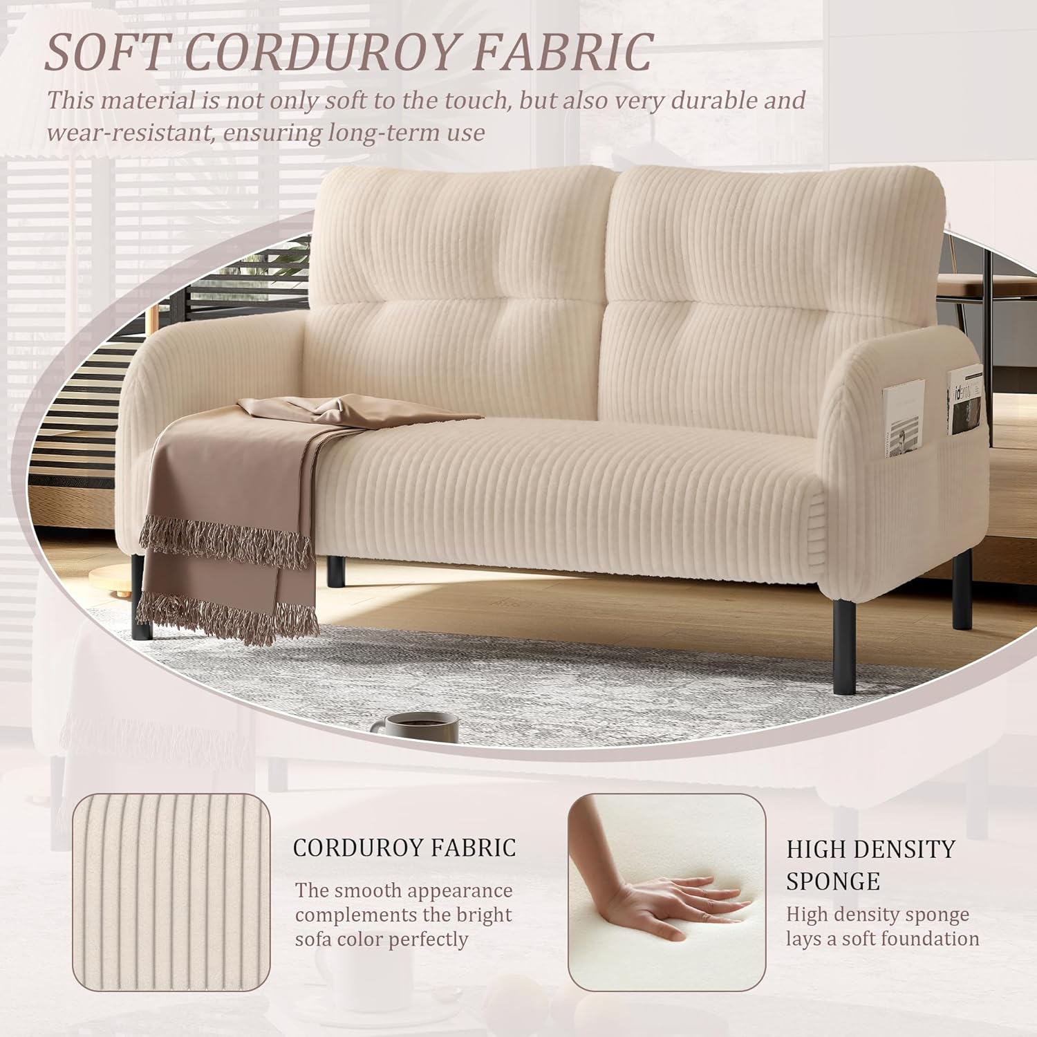 • Ultra-Soft Corduroy Comfort: Designed for relaxation, this compact loveseat couch is wrapped in breathable corduroy fabric—plush to the touch yet highly durable. Perfect for curling up with a book or hosting a friend, it offers cloud-like comfort without sacrificing long-term wear resistance