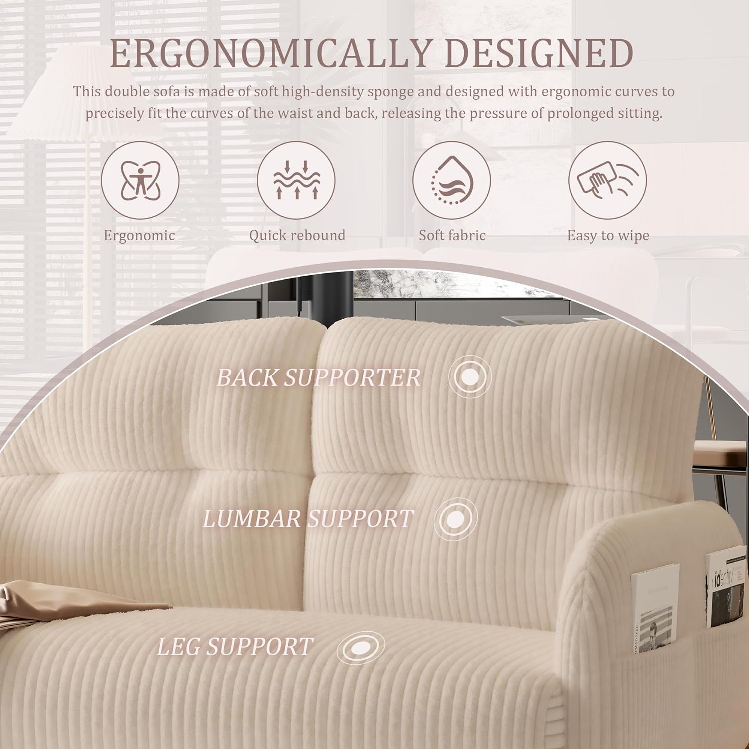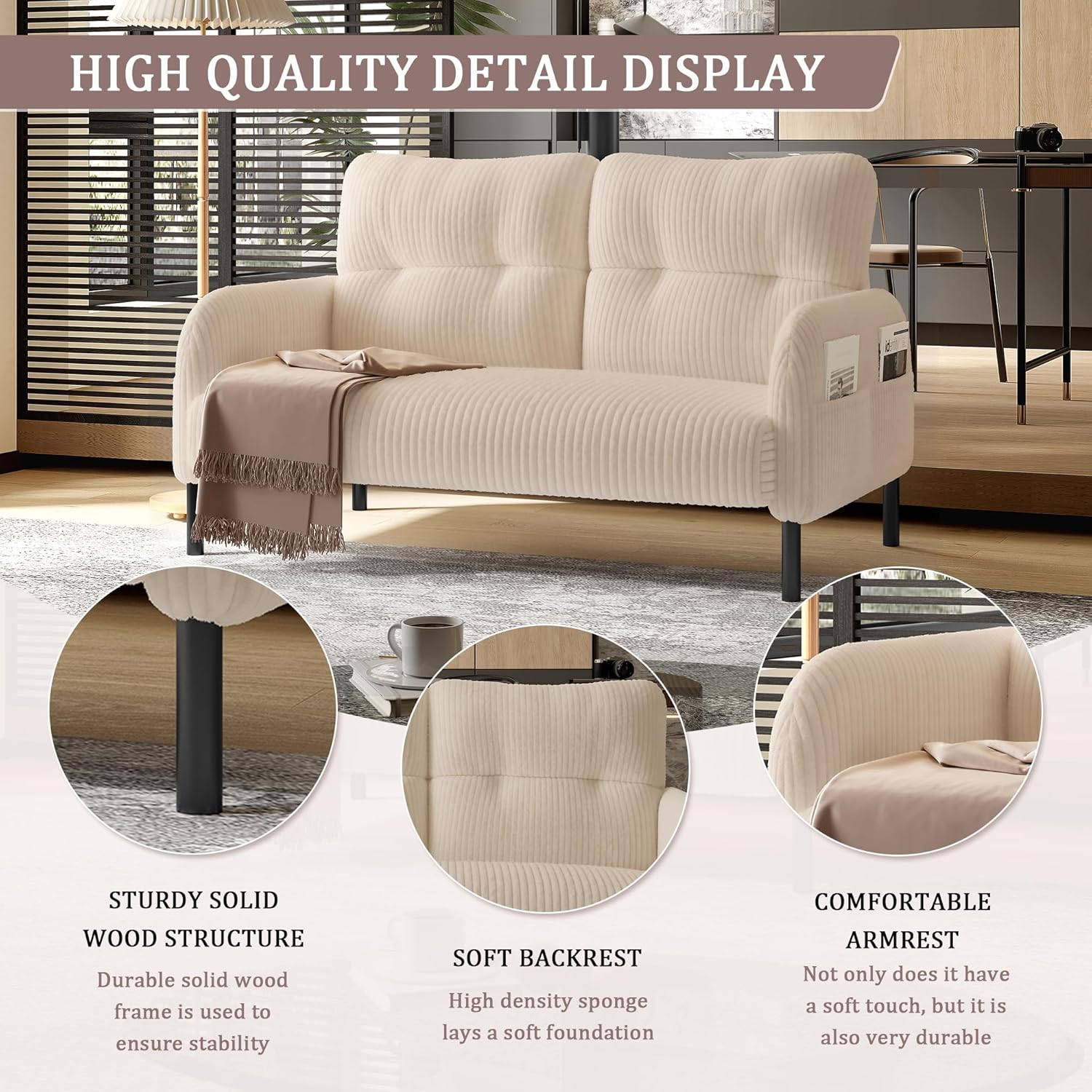 • Modern Monochrome Elegance: Elevate your space with this sleek modern loveseat, featuring a neutral-toned minimalist design that blends effortlessly into apartments, offices, or cozy living rooms. The corduroy upholstered mini sofa adds a touch of sophistication while maintaining a warm, inviting atmosphere